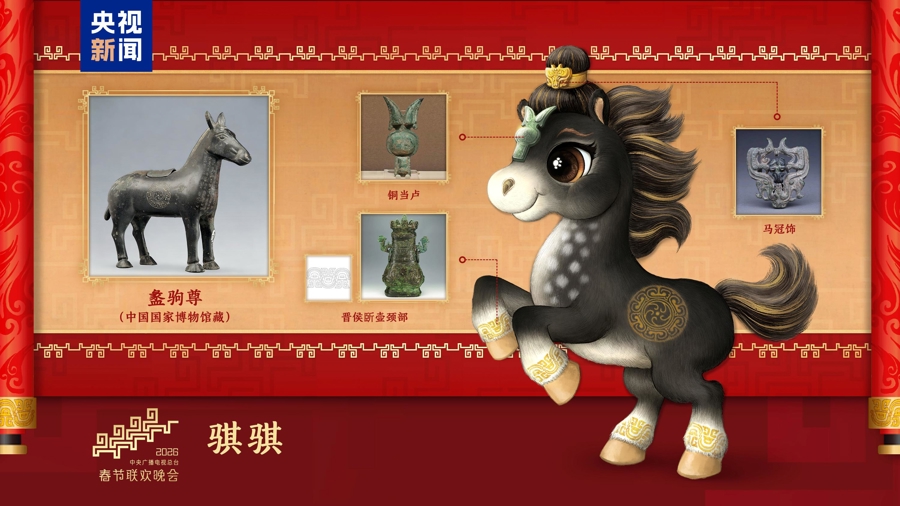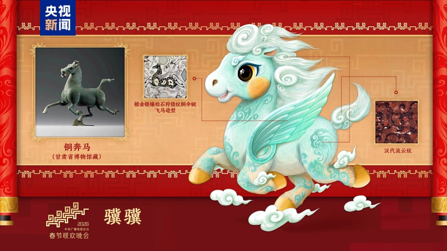 新春将至,骏马添喜!今天,中央广播电视总台正式揭晓《2026年春节联欢晚会》吉祥物形象。四匹名为“骐骐”“骥骥”“驰驰”“骋骋”的骏马集体登场,灵动欢脱、神采飞扬,与本届春晚“骐骥驰骋 势不可挡”的主题紧密呼应。