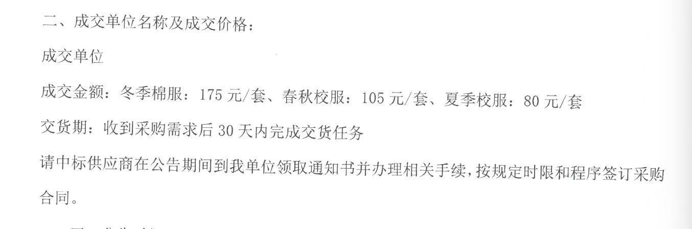10日上午,极目新闻记者在内蒙古招标投标网查询到锦山第三小学校服采购项目招标信息。中标结果显示,成交单位为辽宁省兴城市某服装厂,采购成交金额为冬季棉服每套175元、春秋校服每套105元、夏季校服为每套80元。中标时间为2022年12月。那网友曝光的这件校服也是这家服装厂生产的呢?极目新闻记者联系上厂家负责人张先生,他表示,正在配合调查,若产品不合格,一切由厂方负责。当被问及塑料膜的作用时,张先生称,不用担心有害,不合格的话都是厂家负责。“我们生产的产品都经过检查,不合格的产品不敢生产,有问题的话,厂家都会负责任。”他说。